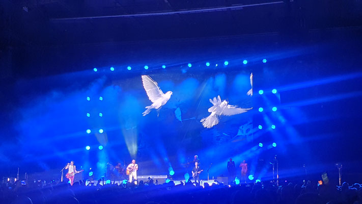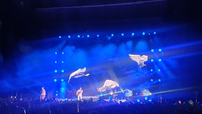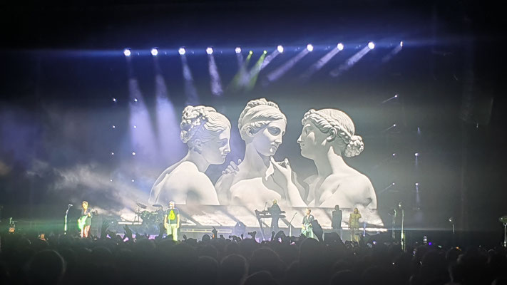 Die leisen Untertöne dürfen aber nicht fehlen. Den gefühlvollen Comeback-Hit „Ordinary World“ (1993) widmet Sänger Simon le Bon den um Frieden kämpfenden Menschen in Israel, Gaza und der Ukraine. Sein Credo: „We believe in their rights, their happiness and peace in their own country, their own ordinary world“. Bei „Come Undone“ hat Backgroundsängerin Anna Ross ihren großen Auftritt, im Hintergrund läuft das bezaubernde Aquarium-Video des Star-Regisseurs Julian Temple. Bei der ersten Zugabe „Save a Prayer“ flattern die Friedenstauben auf dem Screen, während die Fans mit den Smartphones leuchten. Tatsächlich ist die wunderschöne Ballade aus dem Jahr 1982 ein Song über ein flüchtiges Liebesabenteuer („Some people call it a one night stand. But we can call it paradise.“). Den finalen Schlusspunkt setzen Duran Duran mit dem schnittigen 82er-Hit „Rio“, populär geworden durch den eleganten nahe der Karibik-Insel Antigua abgedrehten Yacht-Clip.