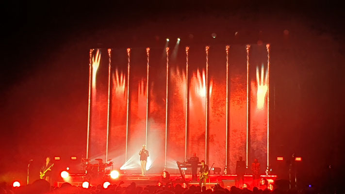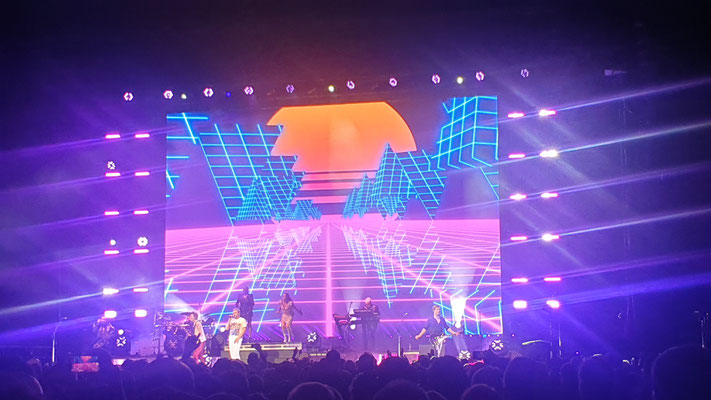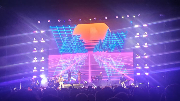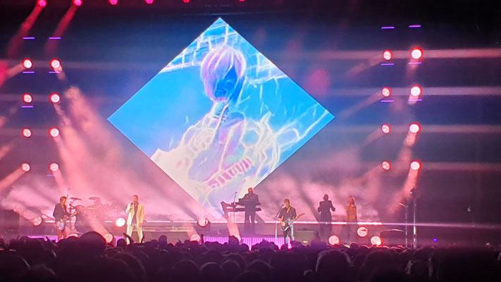 Duran Duran starteten zwei (gute) Splitting-Projekte, Power Station (feat. Robert Palmer) und Arcadia, nachträglich laut Nick Rhodes „a commercial suicide“. Das nächste Album mit dem Chic-angehauchten Titel-Track „Notorious“, natürlich auch auf der Setlist in Berlin, wurde nur mehr mit der Besetzung Simon Le Bon, John Taylor und Nick Rhodes aufgenommen. Immer wieder kreieren Duran Duran bei ihrer Live-Show Mash-Ups ihrer Tracks, so beim Timbaland-´produzierten „Nite Runner“ und dem 89er-Hit „All she wants is“, bei „Superlonely Freak“ (inkl. Cerrones Disco-Klassiker „Super Freak“) und gegen Ende des Main Sets bei „Girls on Film“ und „Psycho Killer“. Der Talking Heads-Klassiker wurde von den Duranies im Rahmen des Halloween-inspirierten Albums „Dance Macabre“ im Jahr 2023 neu eingespielt, und das mit Support der coolen Maneskin-Gitarristin Victoria de Angelis. Der globale Mega-Hit „The Reflex“ (aus dem nur einzigen UK-Nr.1-Abum „Seven and the Ragged Tiger“) und der euphorische Dance-Track „Reach out for the Sunrise“ (2004) sorgten naturgemäß für Tanz-Eskapaden auf den Steh- und Sitzplätzen.