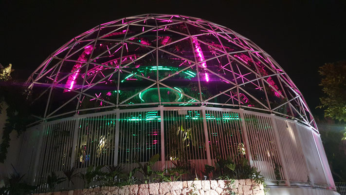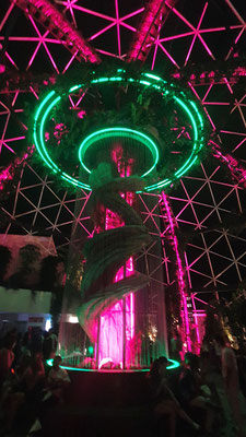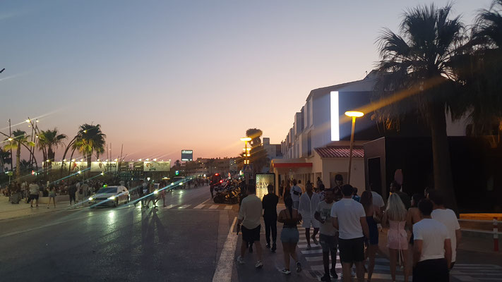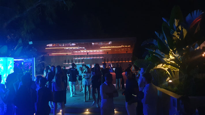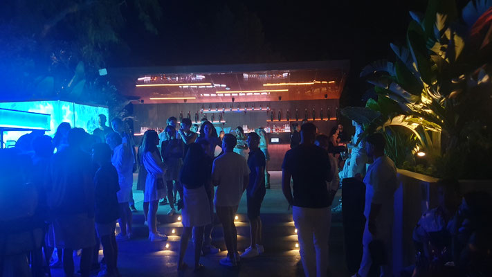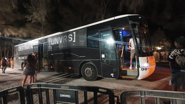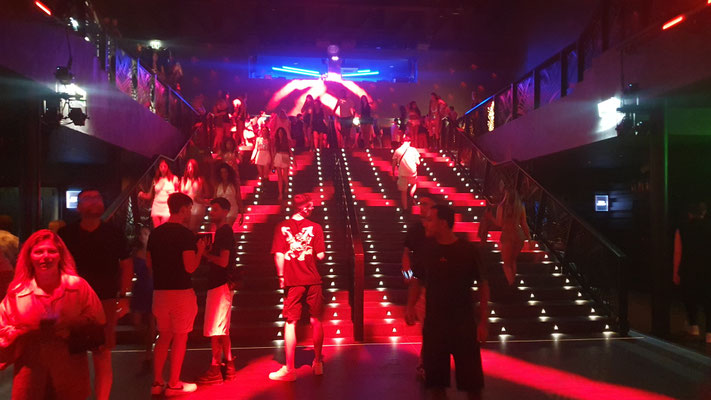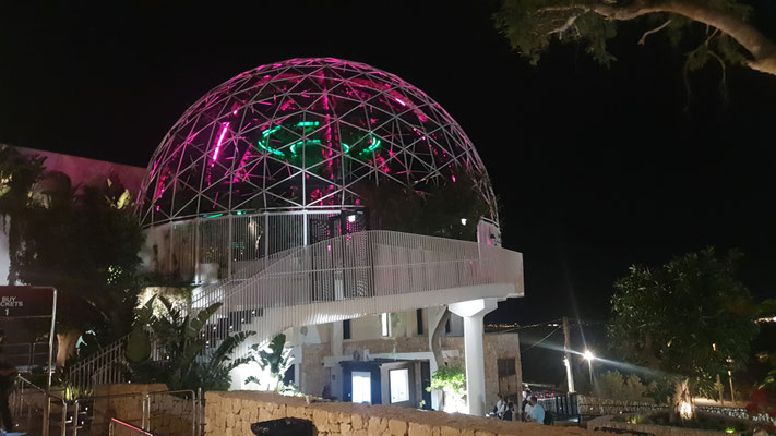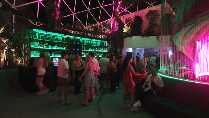 Der Trip in den neuen Hyper-Club, der gleicht einer prickelnden Expedition ins Unbekannte. Im Ticketpreis von rund 100 Euro inkludiert ist eine Busfahrt von der Playa den Bossa mit ebenso faszinierten Party People unmittelbar zum großen Parkplatz vor der Location. Es geht dann zu Fuß leicht aufwärts, bis man bereits den legendären Privilege-Dome erkennt. Dieser ist im Inneren mit Baumgewächsen ausgestattet und enthält eine Freiluftterrasse zum Chillen, Trinken und Talken, die Techno-Parties, die laufen woanders ab.