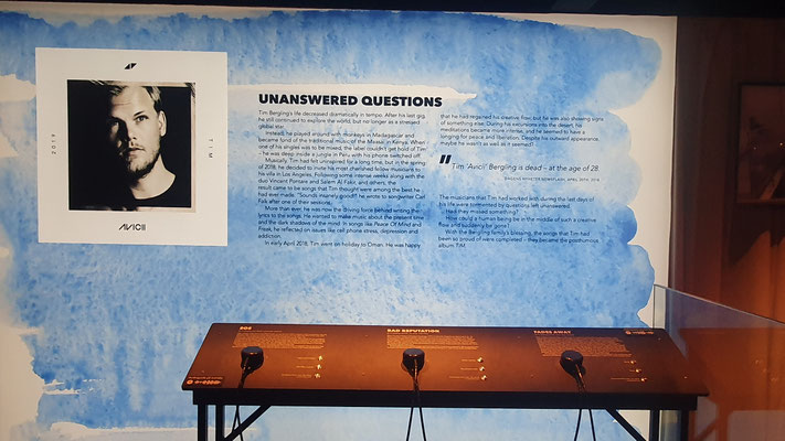 „One day, you′ll leave this world behind. So live a life you will remember!“, ein Zitat aus dem Avicii-Song „The Nights“, steht im Inneren eines Fan-Schranks kurz vor dem Ausgang. Auch er hinterlässt beim Besucher Melancholie und Traurigkeit. Die Ausstellungskuratoren waren sich der emotionalen Komponente durchaus bewusst und widmeten sich ausführlich den mentalen Problemen des Künstlers. Ein Teil der Einnahmen aus dem Avicii Experience geht übrigens an die von seinen Eltern gegründeten Tim Bergling Foundation, die über psychische Erkrankungen und Suizidprävention aufklären soll.